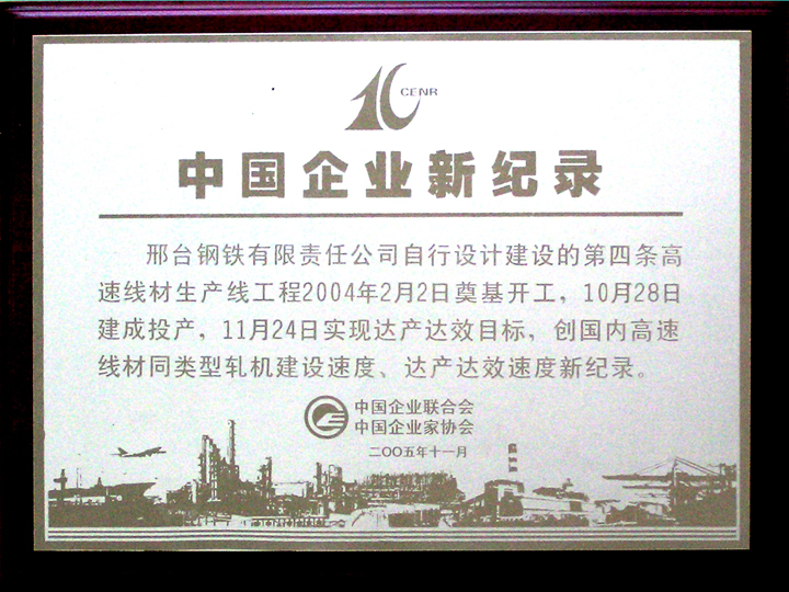 Xingtai Steel's self-designed No.4 high speed rolling line achieved designed capacity on 24th Novermber, 2004, which started construction on 2nd February and put into operation on 28th October, set up new records of the fastest construction speed and the shortest time to achieve designed capacity among alike high speed wire rod projects of China.