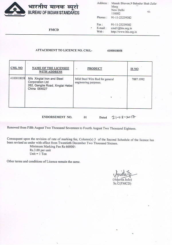 邢鋼申請印度BIS認證的6個產(chǎn)品牌號(對應(yīng)邢鋼49個產(chǎn)品牌號)通過印度國家認證