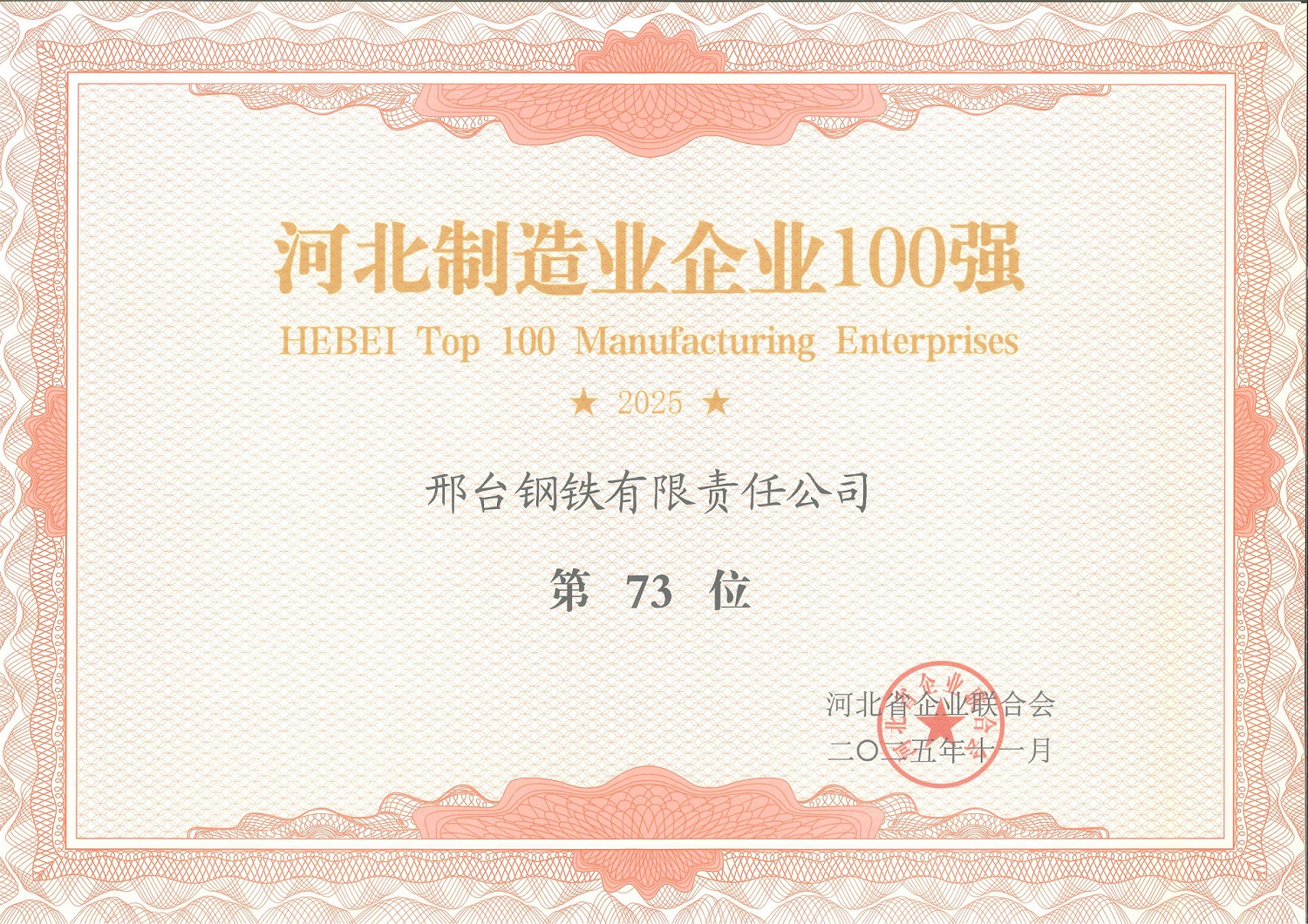 2025 年,邢臺鋼鐵有限責(zé)任公司榮登 “河北制造業(yè)企業(yè) 100 強(qiáng)” 第 73 位