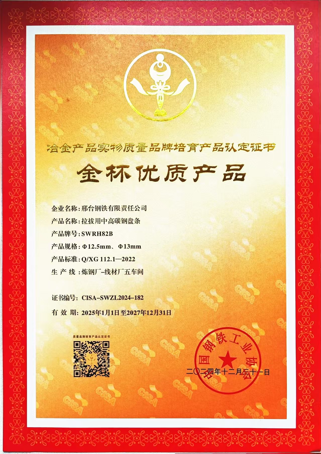 2024年公司拉拔用中高碳鋼盤條SWRH82B產(chǎn)品獲得冶金產(chǎn)品實(shí)物質(zhì)量品牌培育產(chǎn)品(金杯優(yōu)質(zhì)產(chǎn)品)認(rèn)定證書,簡稱金杯獎。“冶金產(chǎn)品實(shí)物質(zhì)量品牌培育”評選活動于24年3月啟動,由中國鋼鐵工業(yè)協(xié)會主辦,金杯獎是中國鋼鐵工業(yè)協(xié)會組織的冶金行業(yè)唯一的比較權(quán)威的獎項(xiàng)。