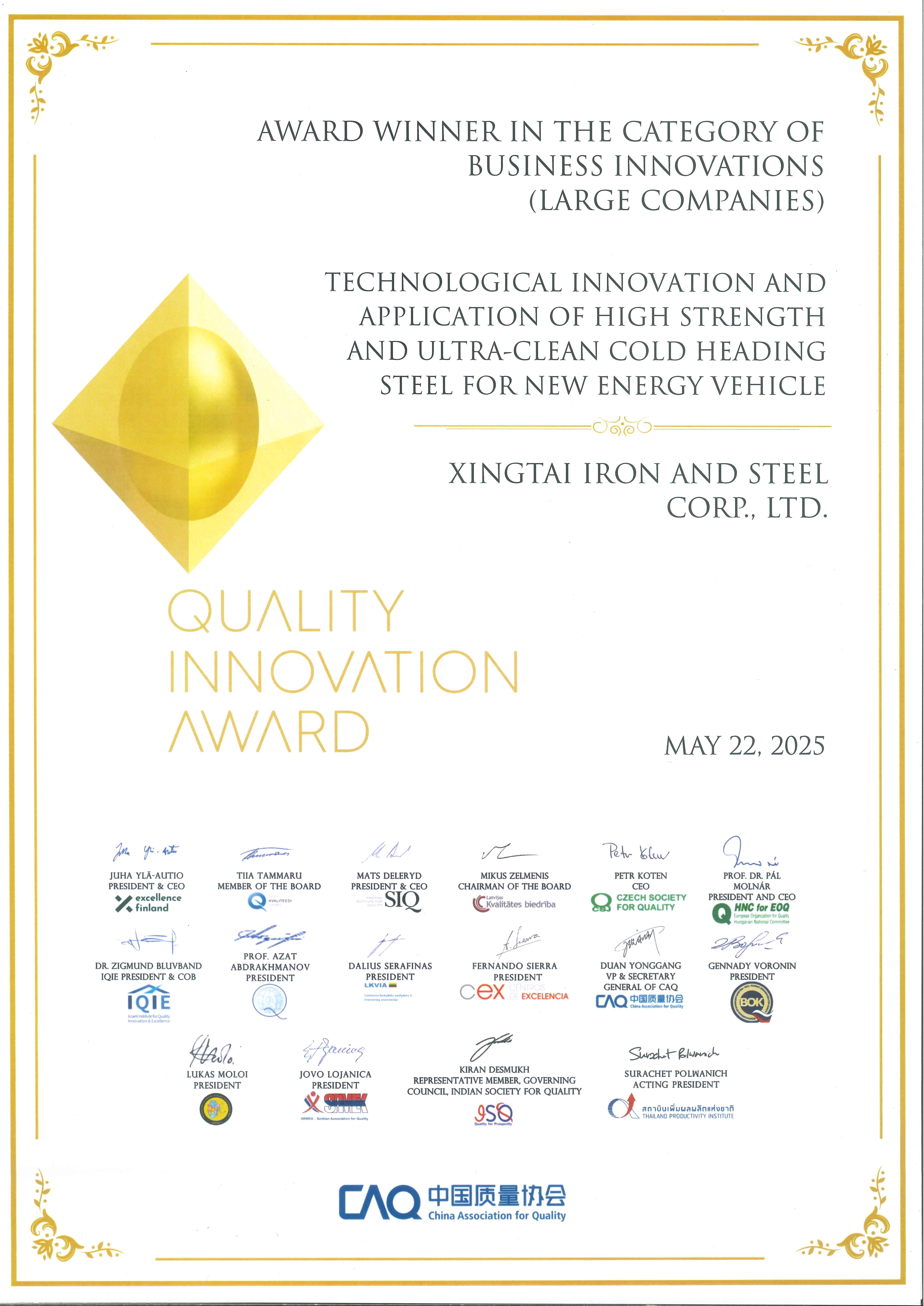 2025.5.22-23邢臺鋼鐵有限責(zé)任公司參加了在泰國舉辦的2024年國際質(zhì)量創(chuàng)新大賽發(fā)布會暨頒獎儀式,邢臺鋼鐵發(fā)布的項(xiàng)目《新能源汽車用高強(qiáng)度超高潔凈度冷鐓鋼技術(shù)創(chuàng)新及應(yīng)用》榮獲該大賽一等獎。這是邢鋼歷史上獲得的首個(gè)國際大獎,也是自國際質(zhì)量創(chuàng)新大賽舉辦以來,在鋼鐵領(lǐng)域首次獲得的國際大獎。