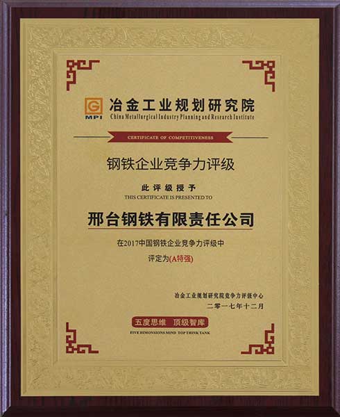 2017年12月,冶金工業(yè)規(guī)劃研究院競爭力評級中心授予邢鋼“在2017中國鋼鐵企業(yè)競爭力評級中評定為A特強(qiáng)”企業(yè)。