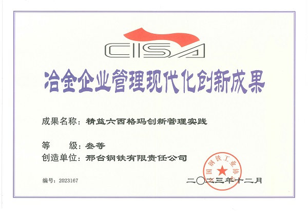 2023年12月,邢鋼《精益六西格瑪創(chuàng)新管理實踐》獲第二十一屆(2023年)冶金企業(yè)管理現(xiàn)代化創(chuàng)新成果獎。
