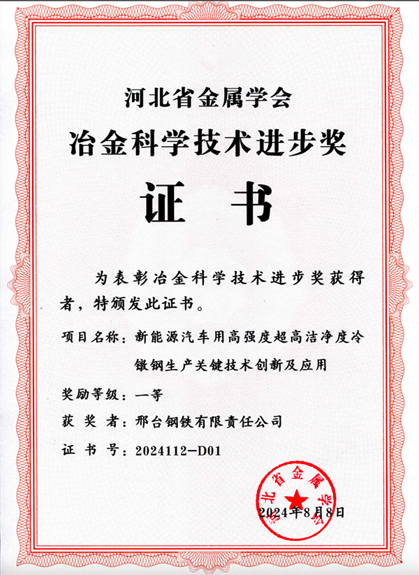 2024年8月8日,邢鋼《新能源汽車用高強度超高潔凈度冷鐓鋼生產關鍵技術創(chuàng)新及應用》項目榮獲河北省冶金科學技術進步獎一等獎。