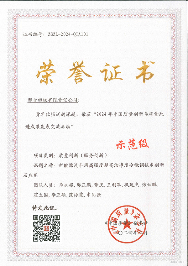 2024年8月,邢鋼《新能源汽車用高強度超高潔凈度冷鐓鋼技術創(chuàng)新及應用》課題榮獲“2024年中國質量創(chuàng)新與質量改進成果發(fā)表交流活動”最高級別的“示范級”榮譽。