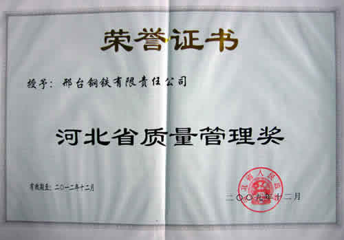 2009年12月,河北省政府授予邢鋼“河北省質量管理獎”。