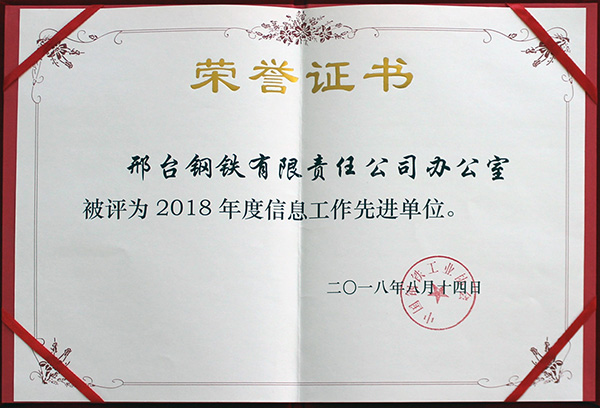 2018年8月14日,邢鋼被中國鋼鐵工業(yè)協(xié)會(huì)評(píng)為“2018年度信息工作先進(jìn)單位”。