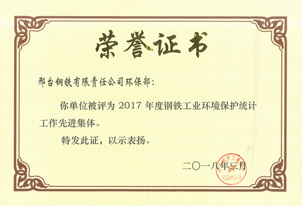 邢鋼被評(píng)為2017年度鋼鐵工業(yè)環(huán)境保護(hù)統(tǒng)計(jì)工作先進(jìn)集體
