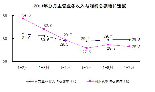 2011年分月主營(yíng)業(yè)務(wù)收入與利潤(rùn)總額增長(zhǎng)速度統(tǒng)計(jì)圖。(國(guó)家統(tǒng)計(jì)局)
