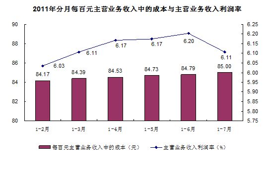 規(guī)模以上工業(yè)企業(yè)實(shí)現(xiàn)主營(yíng)業(yè)務(wù)收入458544億元,同比增長(zhǎng)29.8%。每百元主營(yíng)業(yè)務(wù)收入中的成本為85.00元,主營(yíng)業(yè)務(wù)收入利潤(rùn)率為6.11%。
