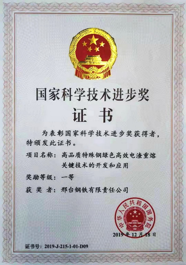 January 10th, 2020, the National Science and Technology Awards Conference2019 was held at the Great Hall of the People. The project of “Development and application of the key technology of green and efficient electroslag remelting of high-quality special steel” which is jointly participated by Xingtai Steel won the first prize of National Science & Technology Progress Award. It was the first time that national steel industry has won this prize in 15 years.