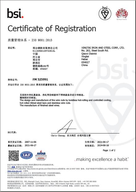 In June, Xingtai Iron and Steel Corp., Ltd. (hereinafter referred to as Xingtai Steel) successfully passes the recertification of QMS IATF 16949 (including IATF 16949:2016 and ISO 9001:2015) after being audited by third-party certification body BSI. So far Xingtai Steel has passed the Automotive Quality Management System certification for 14 consecutive years.