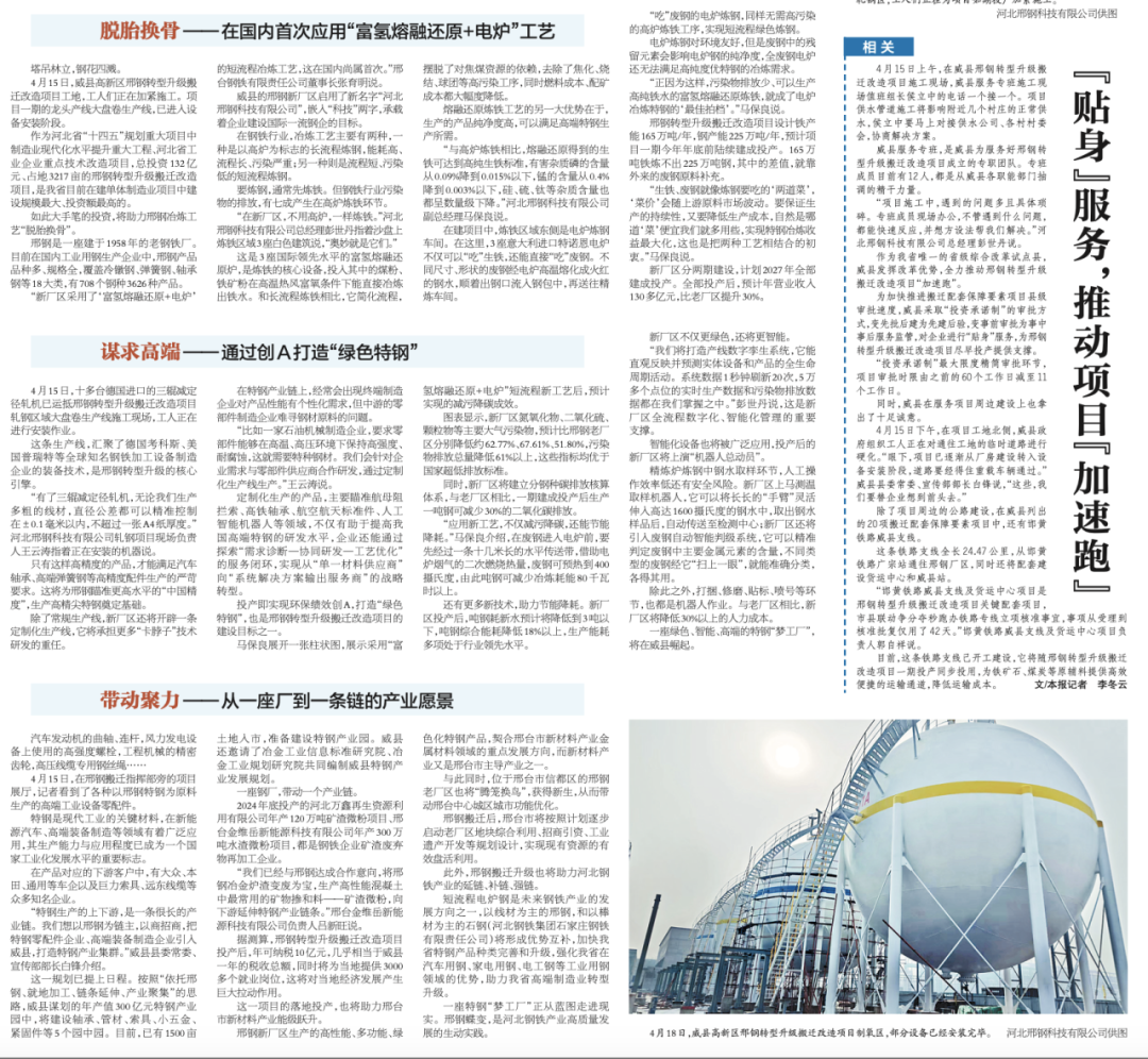 這一項(xiàng)目不僅采用國(guó)內(nèi)首創(chuàng)的“富氫熔融還原+電爐”短流程工藝,還在鋼鐵生產(chǎn)綠色化、智能化、高端化上全面提升,將助力河北鋼鐵產(chǎn)業(yè)轉(zhuǎn)型升級(jí)。