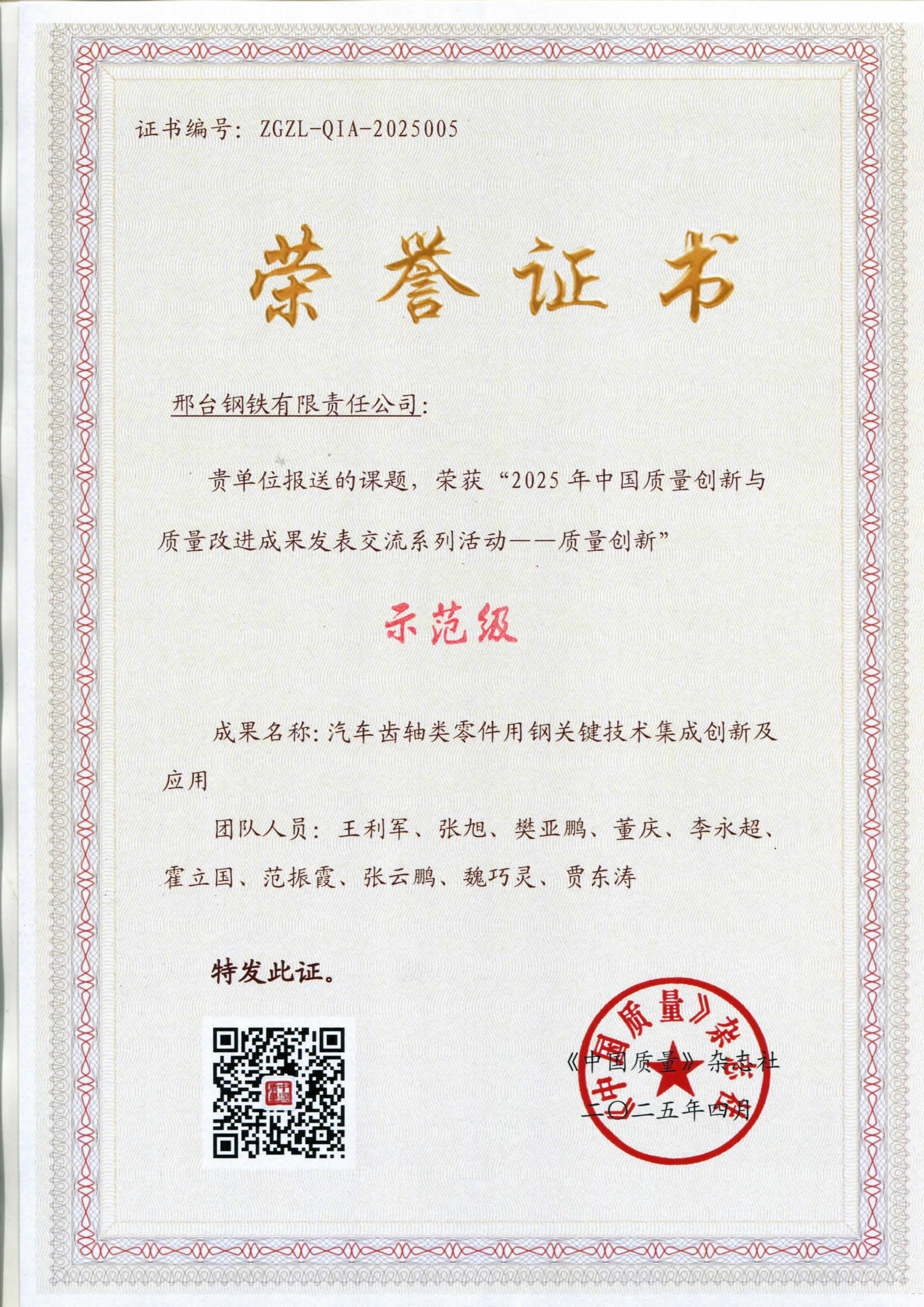 Recently, the "2025 China Quality Innovation and Quality Improvement Achievement Release and Exchange Series Activities" hosted by China Quality Magazine came to a successful conclusion in Guangzhou, Guangdong Province. The project "Integrated Innovation and Application of Key Technologies for Steel Used in Automotive Gear and Shaft Parts" declared by Xingtai Iron and Steel Co., Ltd. (hereinafter referred to as "Xinggang") stood out from many participating achievements with its remarkable innovation, practicality and demonstration, and won the highest "Demonstration Level" award. This is the third consecutive year that Xinggang has won the highest award in this selection activity, following the high-end cold heading steel quality research project in 2023 and the new energy vehicle steel technology innovation project in 2024.