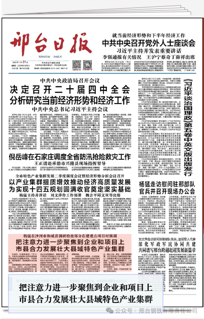 楊猛在調(diào)研中強(qiáng)調(diào),沙河玻璃、邢臺(tái)特鋼在我市傳統(tǒng)產(chǎn)業(yè)轉(zhuǎn)型升級(jí)中具有代表性和示范性,各級(jí)各相關(guān)部門要認(rèn)真落實(shí)省、市委全會(huì)精神,緊緊圍繞“投資消費(fèi)質(zhì)效年”工作主線,把注意力進(jìn)一步向企業(yè)和項(xiàng)目聚焦,潛心抓產(chǎn)業(yè),以有效投資推動(dòng)產(chǎn)業(yè)集群發(fā)展壯大。要常態(tài)化問需于企,強(qiáng)化土地、資金、政策等要素保障,實(shí)打?qū)崕椭髽I(yè)解決困難問題,以一流營商環(huán)境為企業(yè)發(fā)展增動(dòng)能、強(qiáng)信心。要深入推進(jìn)邢商回邢、以商招商,吸引更多上下游配套企業(yè)來邢投資發(fā)展,加快延長產(chǎn)業(yè)鏈,提升產(chǎn)品市場競爭力。